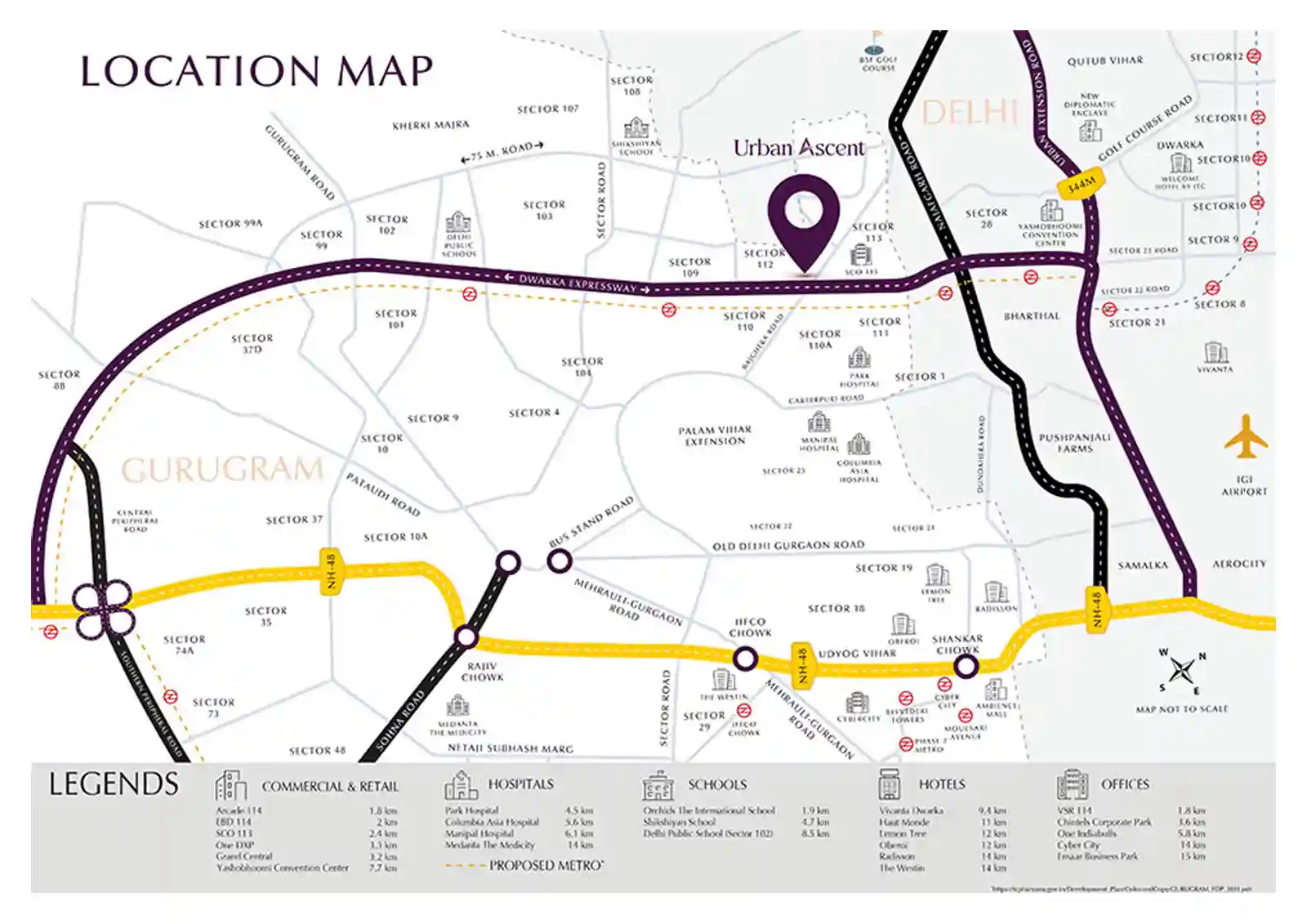 Emaar Urban Ascent, located in New Gurugram, offers prime connectivity along the Dwarka Expressway, linking Delhi to NH-8, and is an investment hub with high-return potential amidst thriving residential growth. Here are the location benefits are as follows: