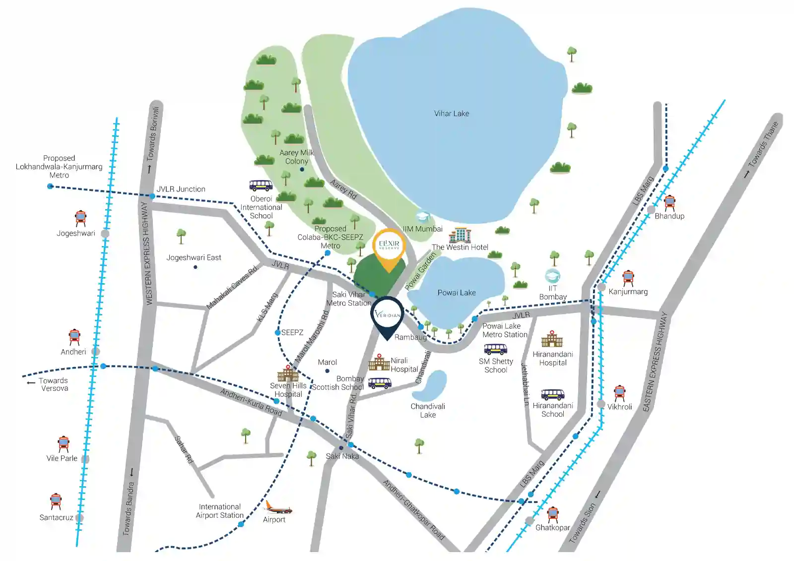 L&T Elixir Reserve Powai has excellent connectivity through significant roadways such as JVLR, the Eastern Expressway, and the Western Expressway. The Sakinaka metro station is also nearby, making daily commutes effortless. Top schools, hospitals, and shopping malls are within close reach, adding to the convenience of residents.